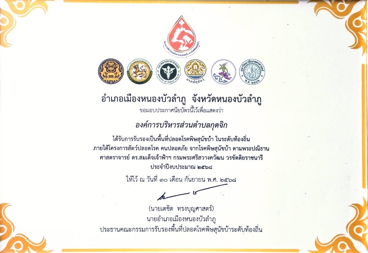 องค์การบริหารส่วนตำบลกุดจิก ได้รับผลการรับรองจากคณะกรรมการให้เป็นพื้นที่ปลอดโรคพิษสุนัขบ้า ระดับท้องถิ่น